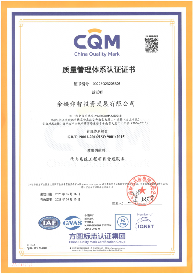 近日,余姚舜智投資發展公司在質量管理領域與技術創新領域均斬獲佳績,不僅順利通過GB/T19001-2016/ISO9001:2015質量管理體系認證并取得證書,而且喜獲5項計算機軟件著作權登記證書,以“質量筑基 + 技術賦能”的組合拳,為數字化轉型注入新動能。